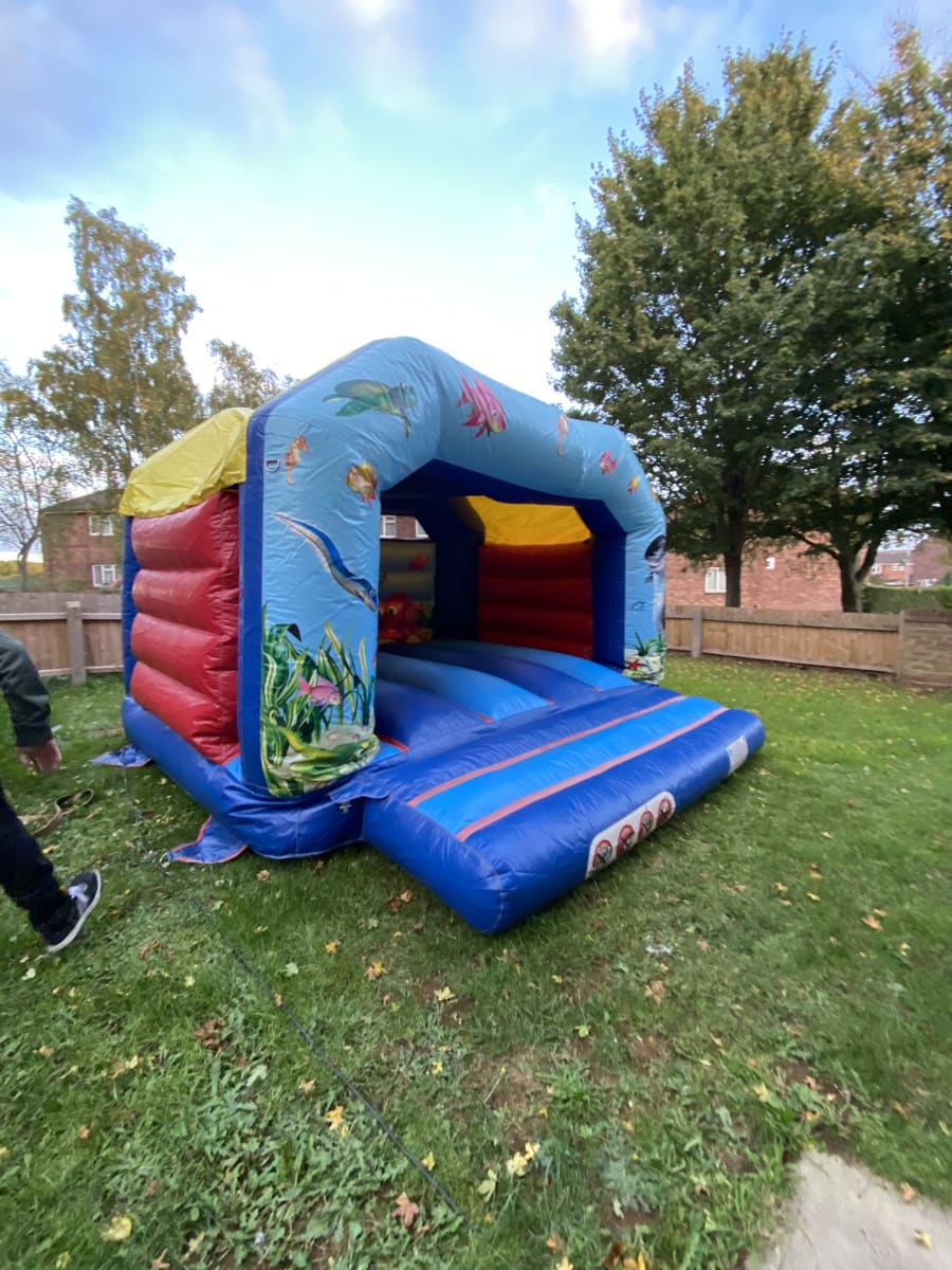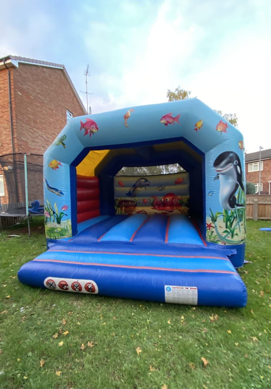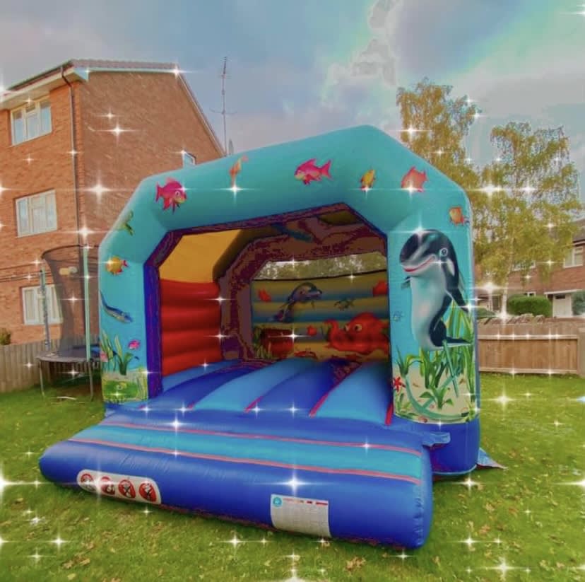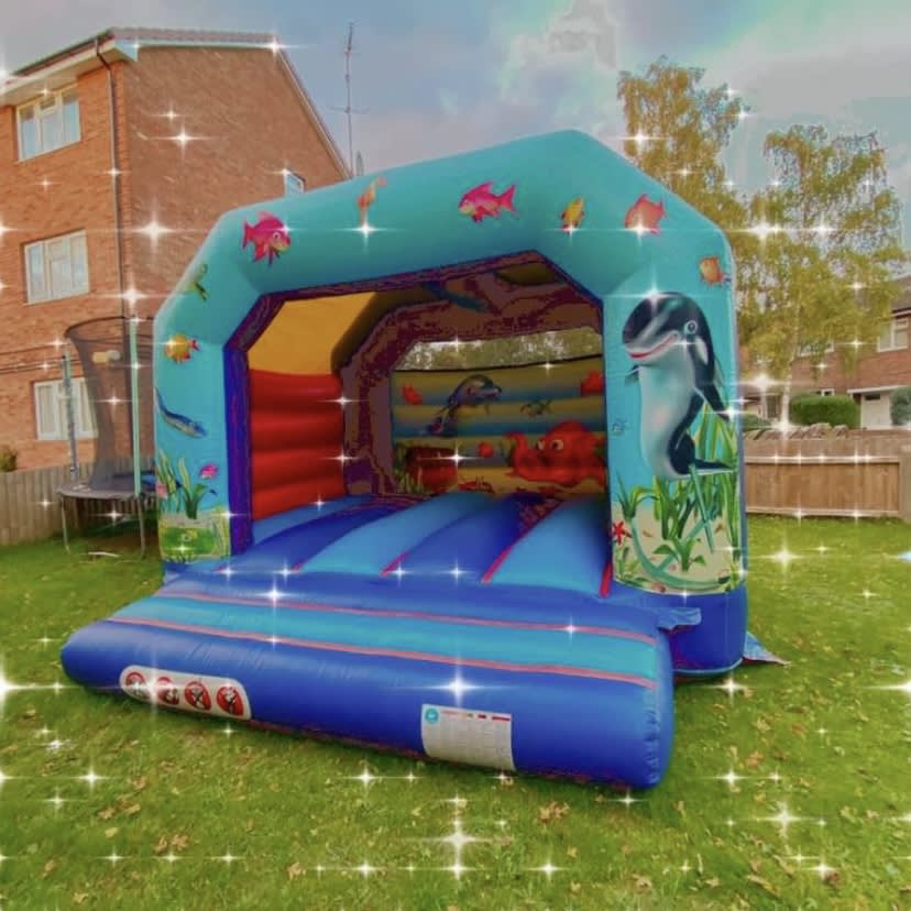 Blue 12ft x 12ft Under The Sea Bouncy Castle featuring images of colourful fish, sharks, octopus and more to give your event an enchanting centre piece